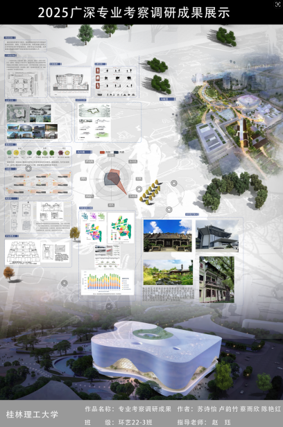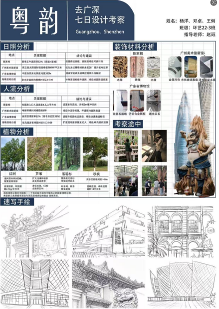课程展览内容分别聚焦地域文化与空间设计的融合。学生从兰圃公园、陈家祠等岭南文化场所中汲取灵感,学习将传统元素转化为现代设计语言。还以“理论联系实地”为核心,注重空间功能、材质与美学的观察。在广州科学中心、深圳前海企业公馆等项目中,学生分析设计逻辑,提升实践认知与设计思维。最后围绕“跨地域设计对比与融合”,引导学生比较广州、佛山、深圳三地的传统与现代建筑风格,探索不同地域文化在设计中的表达与融合。