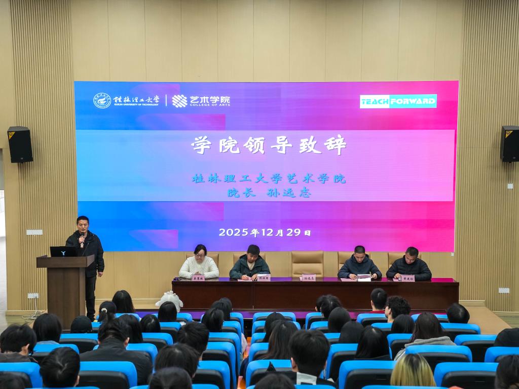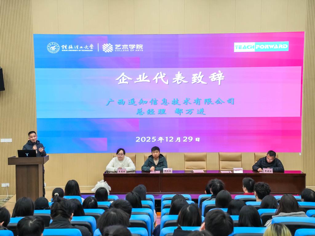 为深化产教融合,对接行业前沿,提升学生实践能力,2025年12月29日下午,我院数字媒体艺术专业与广西遥知信息技术有限公司联合开展的《交互与体验设计》双导师项目实践课程,在博雅讲堂举行项目开题仪式。学院院长孙远志、副院长黄建标、数字媒体艺术教研室主任秦慧敏、课程授课教师马红芝,广西遥知信息技术有限公司总经理鄢万进、项目经理顾兴国,以及数字媒体艺术专业23级全体学生出席活动。