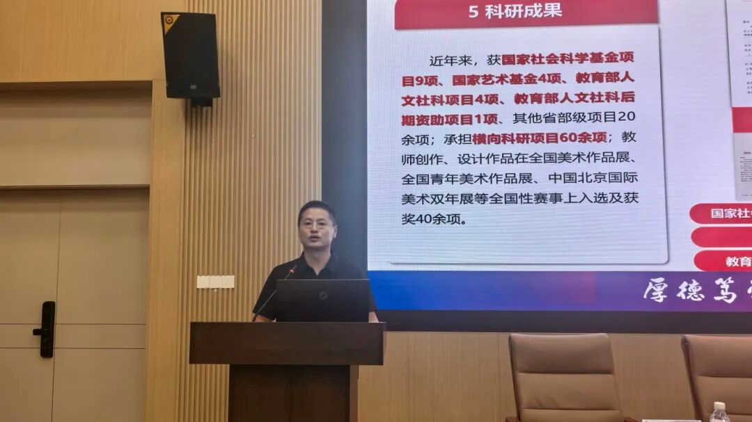 在学院院史院情介绍环节,学院院长孙远志从历史沿革、学科发展、专业建设、师资队伍、科学研究、人才培养及学生工作等方面,系统介绍了艺术学院近年来取得的成就。他指出,学院始终坚持“艺工融合、理实一体”的培养理念,师资力量雄厚,科研成果丰硕,人才培养体系完善,多次承担国家级、省部级项目,并积极服务地方文化建设与乡村振兴。他勉励2025级新生珍惜学院优质资源,潜心学习、刻苦钻研,秉承“厚德笃学、惟实励新”的校训和“博通百艺,雅智匠心”的院训精神,增强对学校学院的认同感与归属感,努力成长为具有家国情怀与社会责任感的高素质艺术人才。