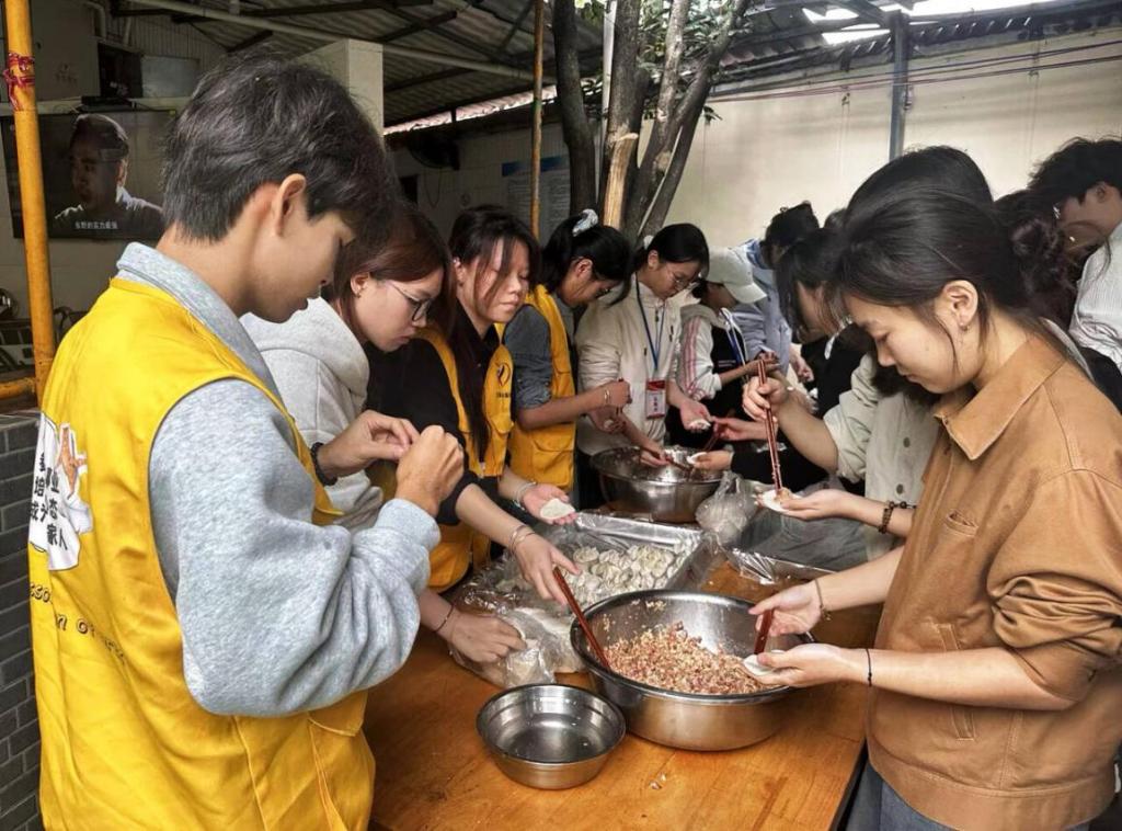 活动中,志愿者们携带食材与工具,与老人们一起包饺子、写春联、剪窗花、聊家常。现场分工有序、暖意融融:同学们剁馅、擀皮、包饺子一气呵成,一个个饱满的饺子承载着满满心意;写对联、剪窗花区域墨香氤氲、笑语盈盈,一幅幅笔力遒劲的春联、一张张寓意吉祥的剪纸,传递着对老人们的美好祝福。