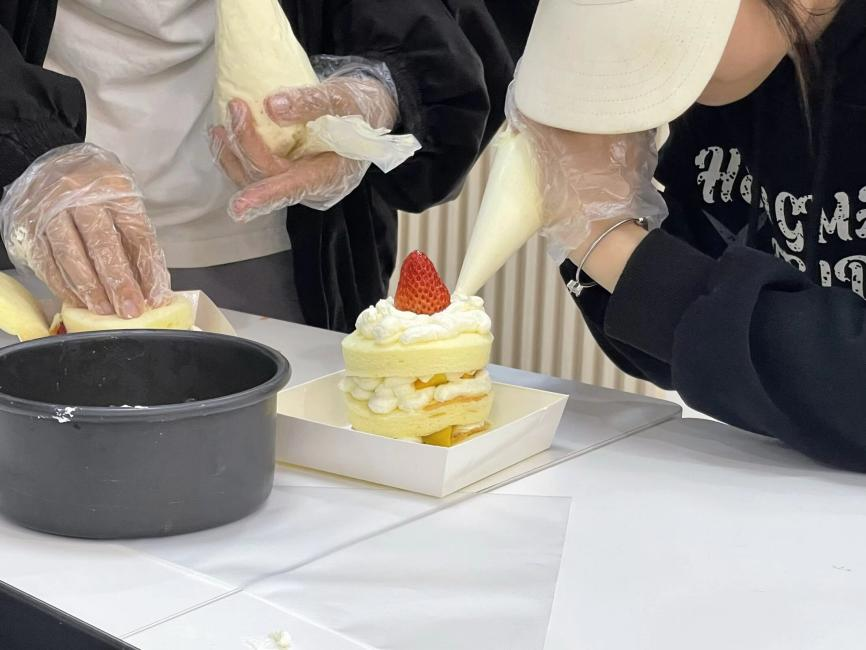 活动现场,烘焙老师向同学们详细讲解了蛋糕制作的基本流程、食材配比和操作技巧,从蛋糕胚的烘烤到奶油的打发,从裱花的手法到装饰的创意,每一个环节都进行了耐心细致的示范。在老师的指导下,同学们纷纷戴上手套、拿起工具,兴致勃勃地开始了自己的创作。大家分工协作、互相配合,有的打发奶油,有的涂抹蛋糕胚,有的精心设计裱花图案,将自己的巧思与心意融入一块块香甜的蛋糕中。
