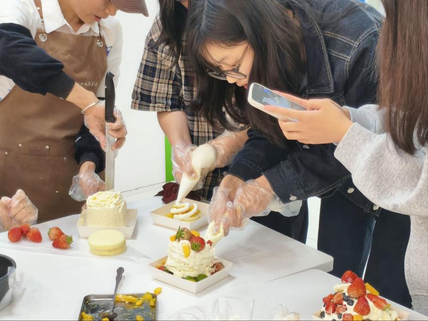 学院的老师也来到活动现场,与同学们亲切交流,共同参与蛋糕制作。师生们一边动手制作,一边分享学习生活中的点滴趣事,现场欢声笑语不断,气氛温馨融洽。经过一个小时的精心制作,一个个造型各异、色彩缤纷的创意蛋糕呈现在大家面前。同学们看着自己亲手制作的成果,脸上洋溢着幸福与自豪的笑容,纷纷拿起手机记录下这美好的瞬间。