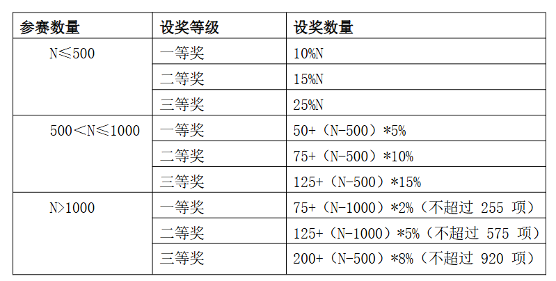 大赛奖项采取统一评审,分类设置奖项的办法,按上述类别分别设奖,各类奖项数量根据本类别参赛人数占总参赛人数的比例确定。总体设奖数量按下表设置,其中 N为参加比赛队伍(作品)数量。