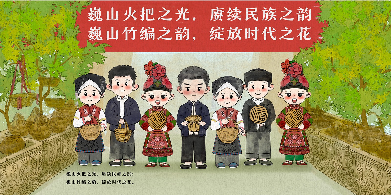 数字绘本《传承民族韵,竹编绽华光》以项目调研对象云南省大理白族自治州巍山彝族回族自治县竹编技艺传承人左玉伟为原型进行创作。作品以“个体成长-技艺创新-文化共生”为叙事线,以“文化传播、技艺传承、产业发展”为三大核心传播目标。在文化传承方面,通过彝族火把节、彝族服饰图案等民族文化元素与竹编元素相融合,增强观者对中华民族文化认同感。在技艺普及方面,作品借助数字AI技术,动态拆解,镜头特写等方式,系统展示了竹编技艺从选竹、破篾到编织的工艺流程,实现了竹编技艺数字化传播效果。在产业发展方面,运用地域品牌故事与竹编产品展示相融合的叙事手法,提升了地方竹编品牌知名度,助力传统竹编产业可持续发展。